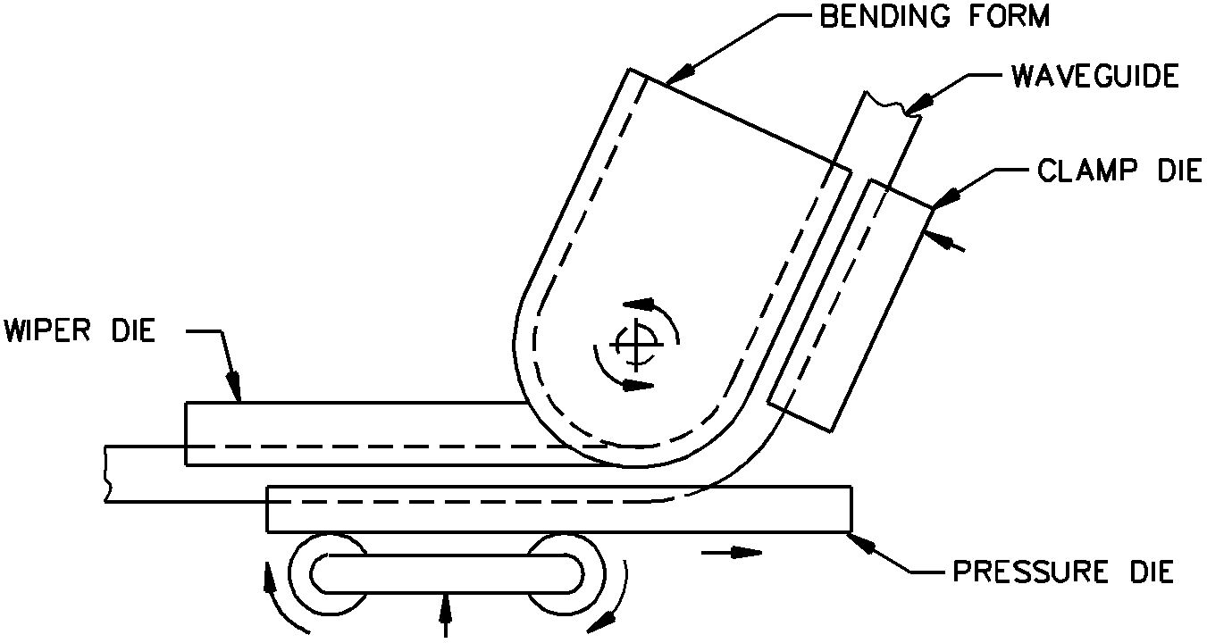 4.4.1.1 Draw bending. In draw bending, the waveguide is clamped to a rotating die. When the form is rotated, the guide is drawn against a pressure die. The mandrel follows the radius while supporting the walls preventing collapse of the guide. The guide is boxed in on all sides by the outer dies. The wiper die used prevents wrinkling or buckling of the guide at the tangent point of the bend. The inside dimensions of the waveguide can be held to tolerances of ±